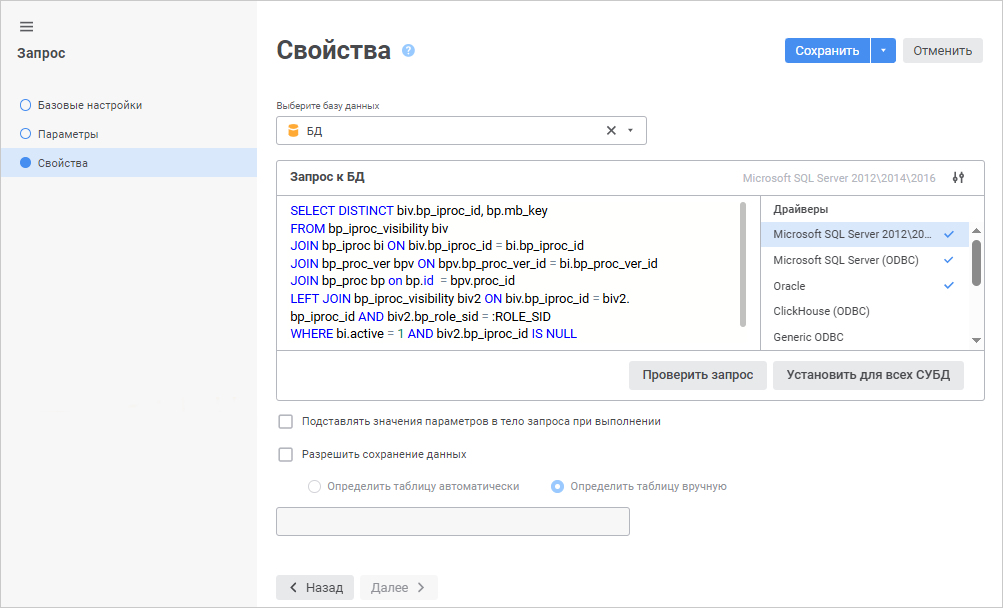Напротив поля «Запрос к БД» отображается выбранный драйвер СУБД и список драйверов. По умолчанию в списке драйверов выделен драйвер, используемый при настройке подключения к репозиторию. Если для одного или нескольких драйверов указан запрос, то в списке драйверов будет установлена отметка.