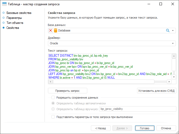 Для завершения работы мастера нажмите кнопку «Готово», после чего будет произведено сохранение запроса. При сохранении запроса происходит: