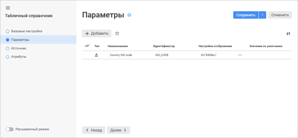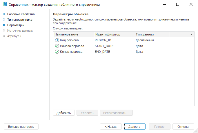 На странице «Параметры» задаётся список параметров объекта. Параметры позволяют формировать содержимое объекта динамически.