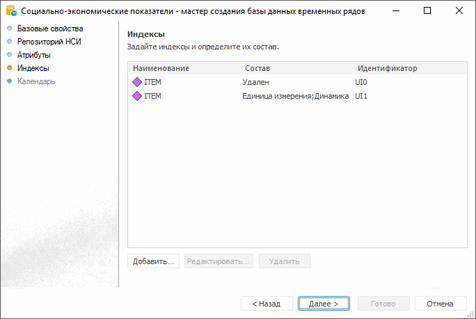 Для создания и редактирования индексов базы данных временных рядов используйте страницу «Индексы»: