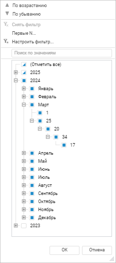 Примечание. Для столбцов, содержащих значения типа «Дата», доступна возможность выбора как элементов, так и уровней иерархии.