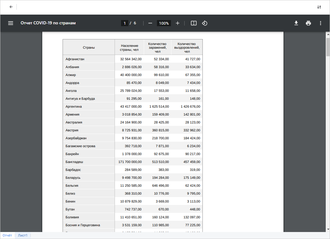 Выберите нужную вкладку с наименованием листа для печати отдельного листа отчёта. Для печати всего отчёта перейдите на вкладку «Отчёт».