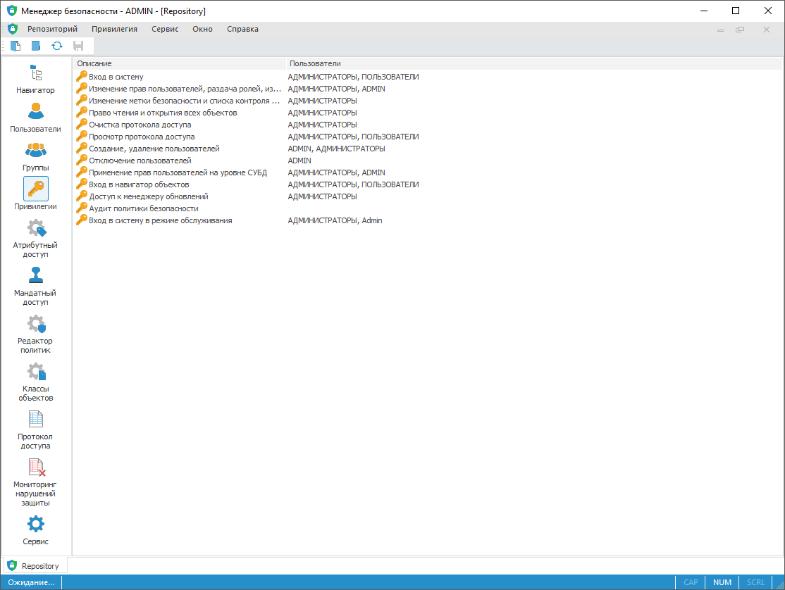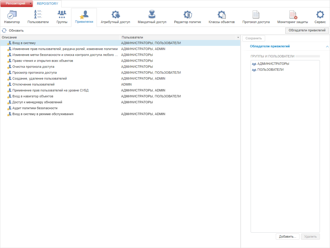 Примечание. При разделении ролей между администратором информационной безопасности и прикладным администратором раздел «Привилегии» будет доступен только администратору информационной безопасности.