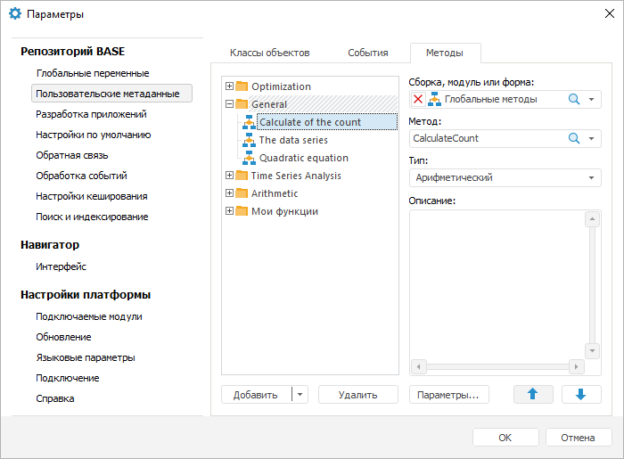 Для подключения пользовательских функций используйте вкладку «Методы» в разделе «Пользовательские метаданные» окна «Параметры». Все методы, добавленные на данной вкладке, будут подключены в раздел пользовательских функций в инструментах продукта «Форсайт. Аналитическая платформа».
