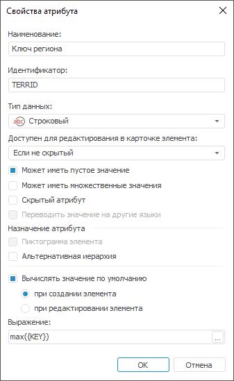 Для всех системных атрибутов в окне «Свойства атрибута» возможно редактирование наименования и назначения атрибута. Также для всех системных атрибутов кроме атрибута «Наименование (NAME)» можно изменить настройку отображения атрибута в справочнике «Скрытый атрибут». Для атрибута «Наименование (NAME)» доступна настройка «Вычислять значение по умолчанию». В поле «Выражение» установите формулу, с помощью которой будет формироваться наименование элемента.