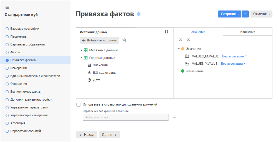Если в кубе настроено несколько фактов, то для хранения вложений задаётся один справочник для вложений.