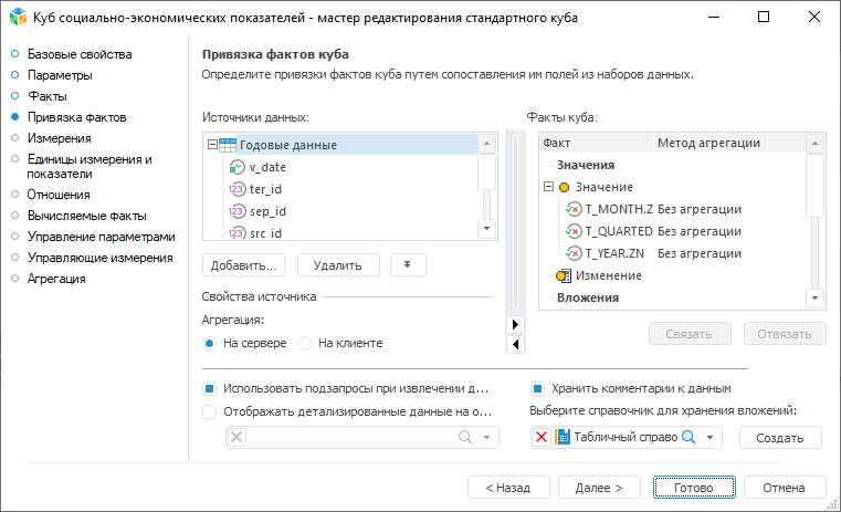 На странице «Привязка фактов» происходит привязка полей источников данных к фактам куба.