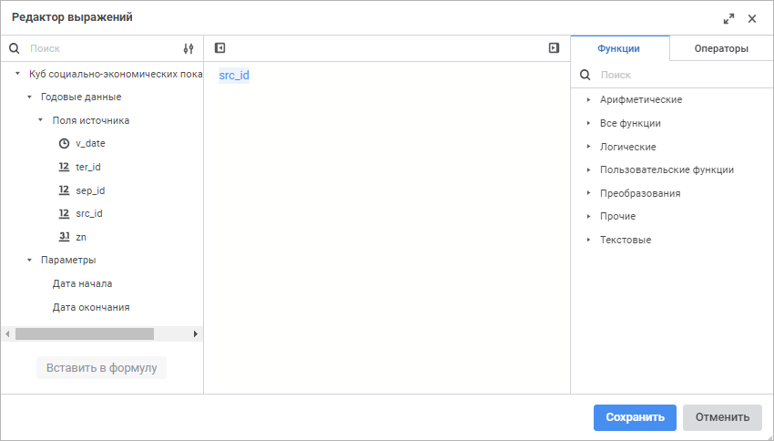 редактор выражения в настольном приложении универсален для всех инструментов и объектов платформы. Описание универсального редактора выражения приведено в разделе «Создание формул и выражений»;