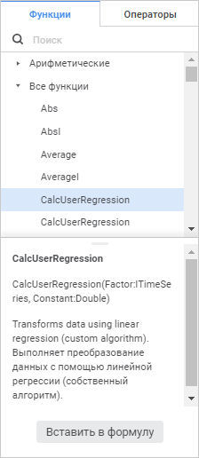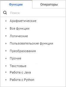 Для быстрого поиска функции или оператора начните вводить функцию/оператор частично или целиком в строке поиска. После выполнения действия на панели функций и операторов будут отображены функции/операторы, удовлетворяющие условиям поиска.