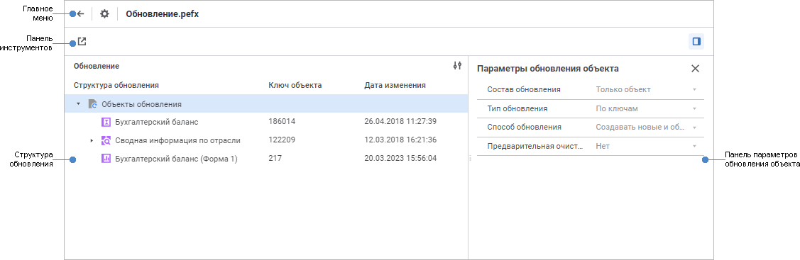 Менеджер обновлений. В веб-приложении позволяет открывать обновление из файла на просмотр. В настольном приложении позволяет создавать и открывать обновление из файла/репозитория.