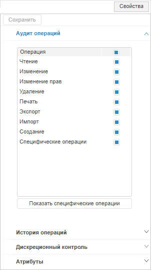В списке общих операций содержится строка и кнопка «Специфические операции»/«Показать специфические операции», которая определяет настройку аудита по специфическим операциям.