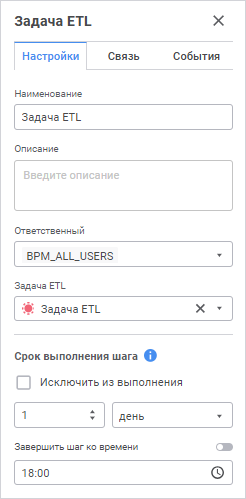 Для выполнения задачи ETL с теми же параметрами, что и запущенный шаг процесса, выполните настройку связи задачи ETL и процесса на вкладке «Связь» панели параметров шага: