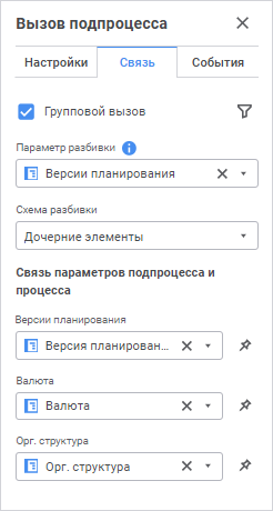 Групповой вызов. Установите флажок «Групповой вызов» для запуска нескольких подпроцессов и задайте параметры из раскрывающихся списков: