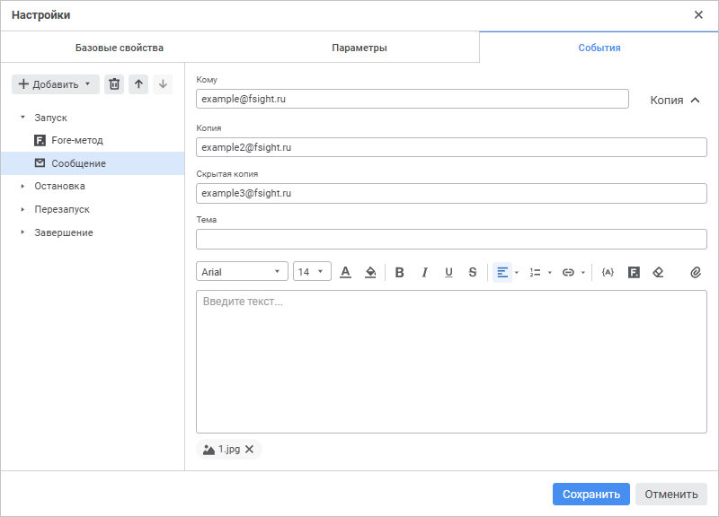 Настройка событий процесса с автоматически выполняемыми действиями осуществляется на вкладке «События» окна «Настройки».