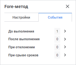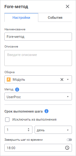 Для настройки выполнения Fore-метода определите обязательные параметры на панели параметров выбранного события: