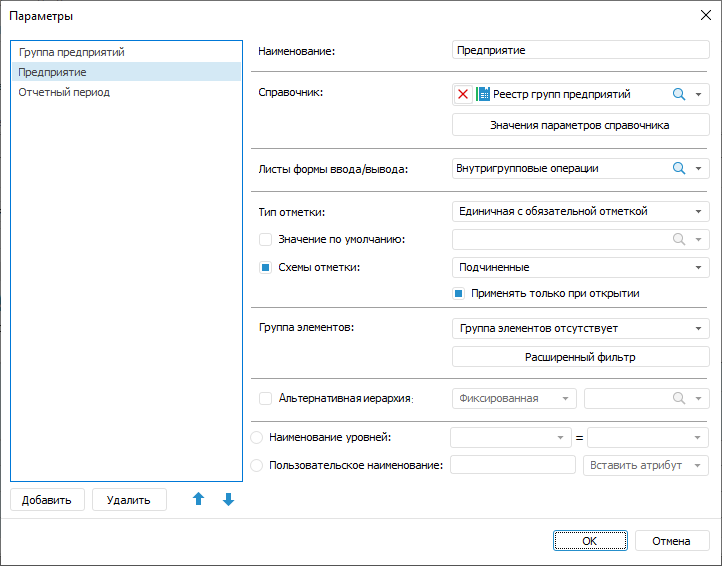Для остальных параметров необходимо ввести/выбрать (в зависимости от типа параметра) значения и нажать кнопку «ОК».