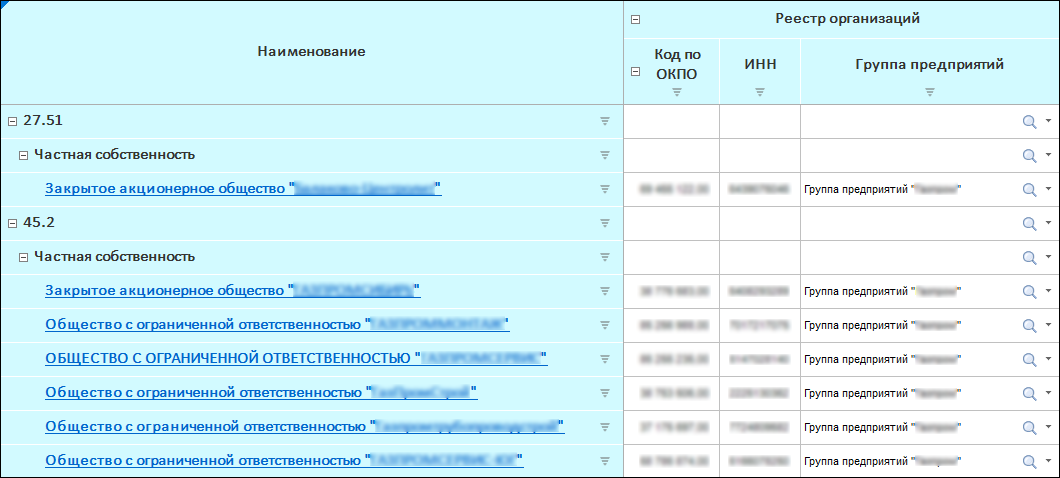 Группировка измерений боковика применяется для объединения элементов по заданным атрибутам. Группировка распространяется на элементы одного измерения. Если в боковике отображается несколько измерений, напротив группировочного элемента будет отображён первый элемент следующего измерения. Если и для следующего измерения настроена группировка, то будет отображён группировочный элемент следующего измерения. Группировку можно настроить для каждого измерения, отображаемого в боковике, кроме измерения, для которого настроена альтернативная иерархия. Группировку можно настроить для конкретного уровня справочника.