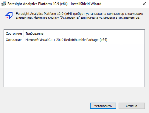 После нажатия кнопки «Установить» будет произведена попытка последовательной установки всех предлагаемых компонентов. Если необходимые пререквизиты отсутствуют в папке «ISSetupPrerequisites», то установка «Форсайт. Аналитическая платформа» будет остановлена и будет выдано соответствующее сообщение.