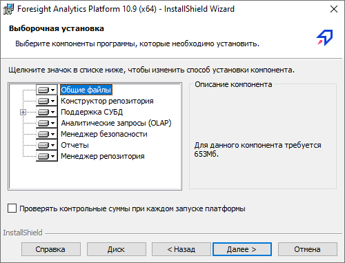 Флажок «Проверять контрольные суммы при каждом запуске платформы» определяет, будет ли проводиться проверка целостности продукта «Форсайт. Аналитическая платформа». При установленном флажке проверка контрольных сумм для исполняемых файлов производится в момент их загрузки. При каждом запуске «Форсайт. Аналитическая платформа» загружается минимальный набор исполняемых файлов, а по мере обращения к функциональности загружаются дополнительные библиотеки, необходимые для работы. По умолчанию флажок снят и проверка целостности продукта «Форсайт. Аналитическая платформа» не производится. Значение опции применяется только для устанавливаемого релиза.