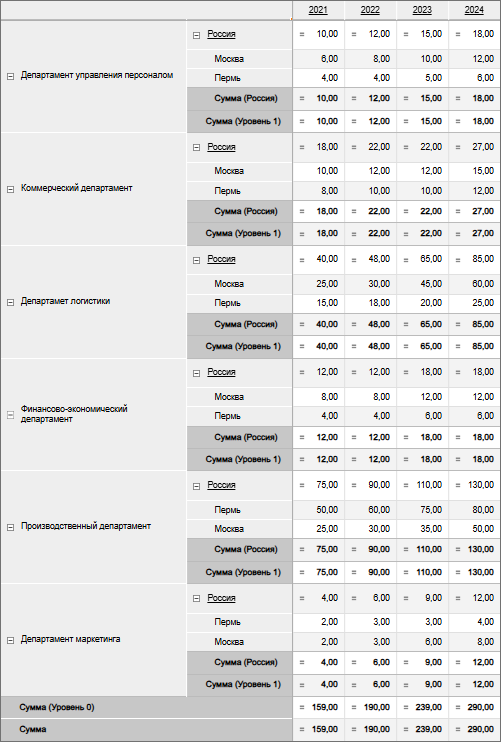 Для отображения итогов по иерархии/уровням установите флажок «Рассчитывать итоги по иерархии»/«Рассчитывать итоги по уровням».