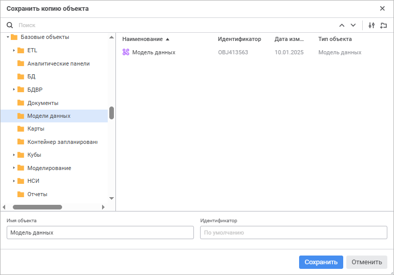 Если объект с идентификатором, указанным в окне «Сохранить копию объекта», уже существует, то при попытке создания копии модели данных появится окно подтверждения действия. Подтвердите действие для замены существующего объекта копией модели данных.