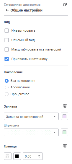 Для настройки вида отображения, типа накопления, заливки фона и границы диаграммы используйте группу параметров «Общие настройки» панели настроек.