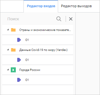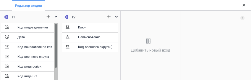 Примечание. Вкладка «Редактор входов» показана на примере преобразователя «Объединение». Вид панели и количество доступных входов зависит от типа преобразователя.