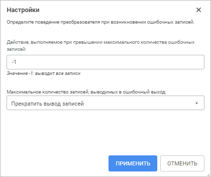 Примечание. Вкладка «Выход для записей с ошибками» показана на примере преобразователя «Объединение». Вид панели и количество доступных выходов зависит от типа преобразователя.