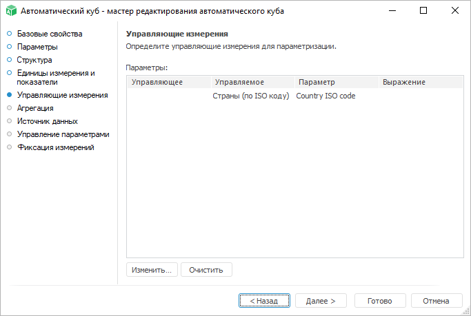 При нажатии кнопки «Очистить» для управляемого параметра не будут определены управляющее измерение и выражение.