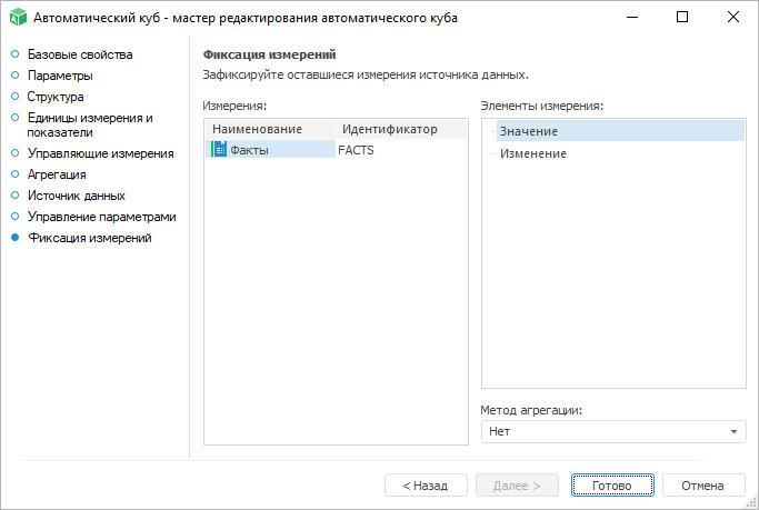 На странице «Фиксация измерений» необходимо зафиксировать элементы измерений источника данных, которые не были сопоставлены с измерениями автоматического куба: