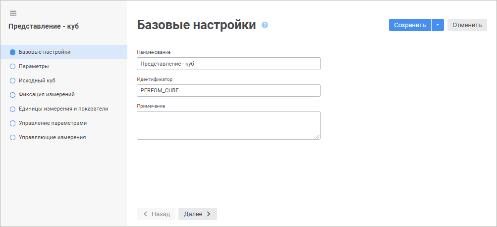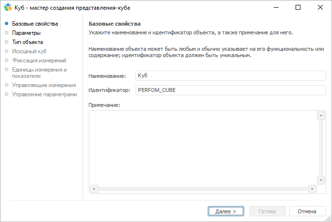 На странице «Базовые настройки» в веб-приложении и «Базовые свойства» в настольном приложении задаются наименование объекта, идентификатор и примечание.
