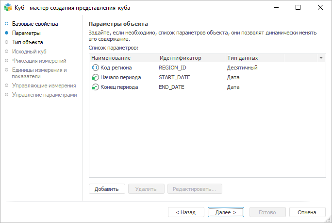 На странице «Параметры» задаётся список параметров объекта. Параметры позволяют формировать содержимое объекта динамически.
