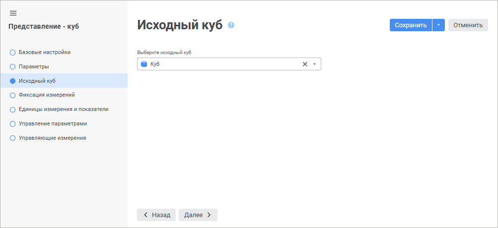 На странице «Исходный куб» выбирается куб, на основе которого будет построен представление-куб.