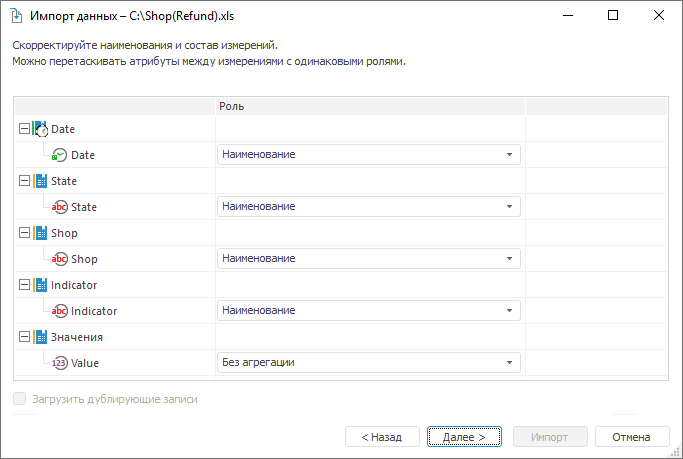 Если выбран метод агрегации, то будет доступен флажок «Загрузить дублирующие записи». По умолчанию он снят. При установленном флажке будут импортированы все записи. Импортированные дублирующие записи в дальнейшем могут использоваться, например, при просмотре детализированной информации по агрегированным данным.