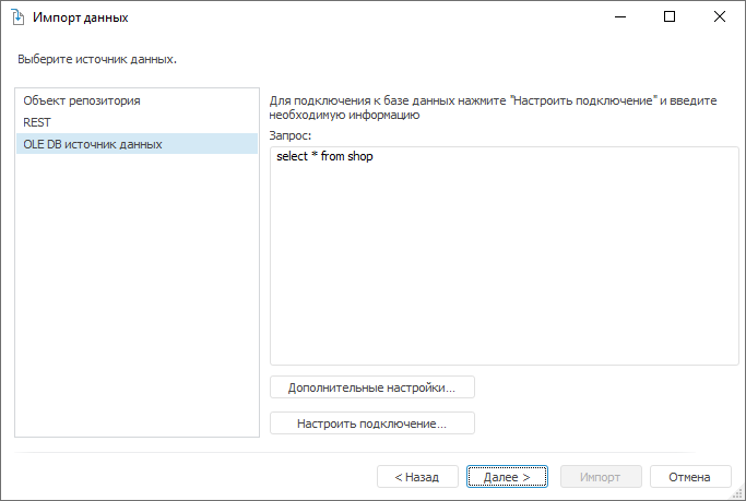Microsoft Access. В дополнительном поле «SQL-запрос» задайте запрос к таблицам базы данных и нажмите кнопку «Выполнить». На основании запроса будут получены и отображены импортируемые данные;