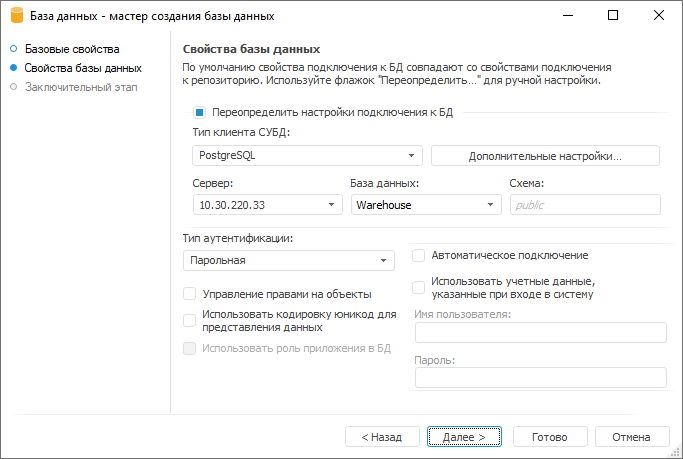 Свойства базы данных. Указывается тип системы управления базами данных (СУБД), установленной на сервере, а также дополнительные параметры подключения;