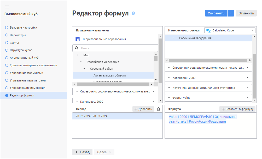 При закрытии редактора формул автоматически сохраняются выбранный куб-источник, порядок расположения измерений кубов-источников и куба-назначения, отмеченные элементы измерений, вид отображения наименований в измерениях и в формулах, а также параметры, с которыми были построены измерения. При последующем открытии редактора формул вычисляемого куба он будет открыт с сохраненными ранее настройками.