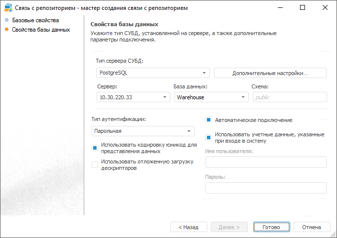 Свойства базы данных. Задаются настройки подключения к базе репозитория, с которым необходимо создать связь.