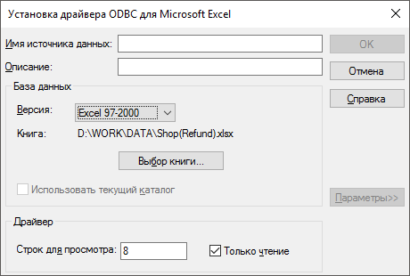 В зависимости от выбранного драйвера открываемые диалоги будут иметь различный вид. Пример диалога для настройки драйвера Microsoft Excel: