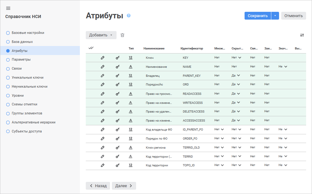 На странице «Атрибуты» в веб-приложении и настольном приложении формируется список атрибутов справочника.