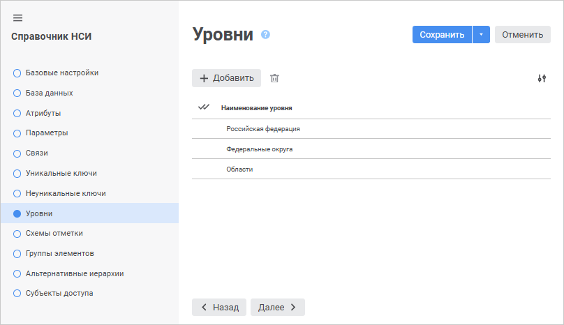 В веб-приложении для перехода на вкладки мастера «Схемы отметки», «Группы элементов», «Альтернативные иерархии» сохраните настройки справочника, для этого нажмите кнопку «Сохранить».