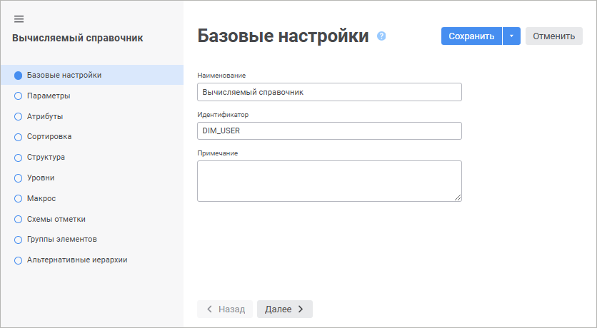 На странице «Базовые настройки» в веб-приложении и «Базовые свойства» в настольном приложении задаются наименование объекта, идентификатор и примечание.