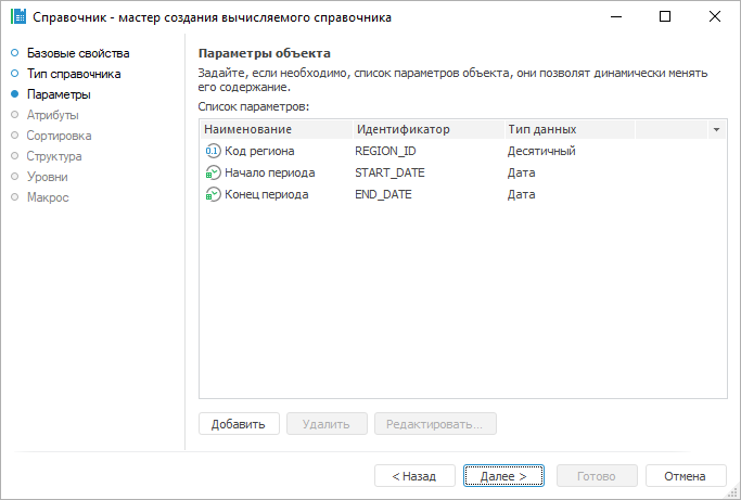 На странице «Параметры» задаётся список параметров объекта. Параметры позволяют формировать содержимое объекта динамически.