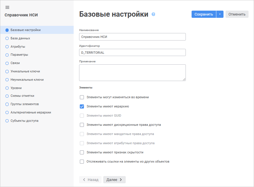 • Схемы отметки. Задаются схемы отметки для автоматизации выделения элементов справочника по заданным правилам. Переход на страницу доступен после сохранения настроек справочника;