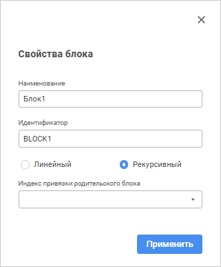 В области «Блоки и индексы справочника» выделите «Блоки» и нажмите на кнопку «Добавить блок». В открывшемся окне установите переключатель «Рекурсивный» и нажмите «ОК»: