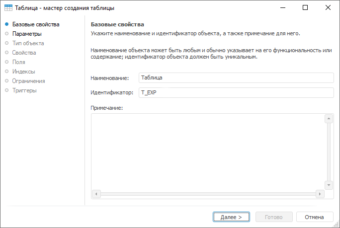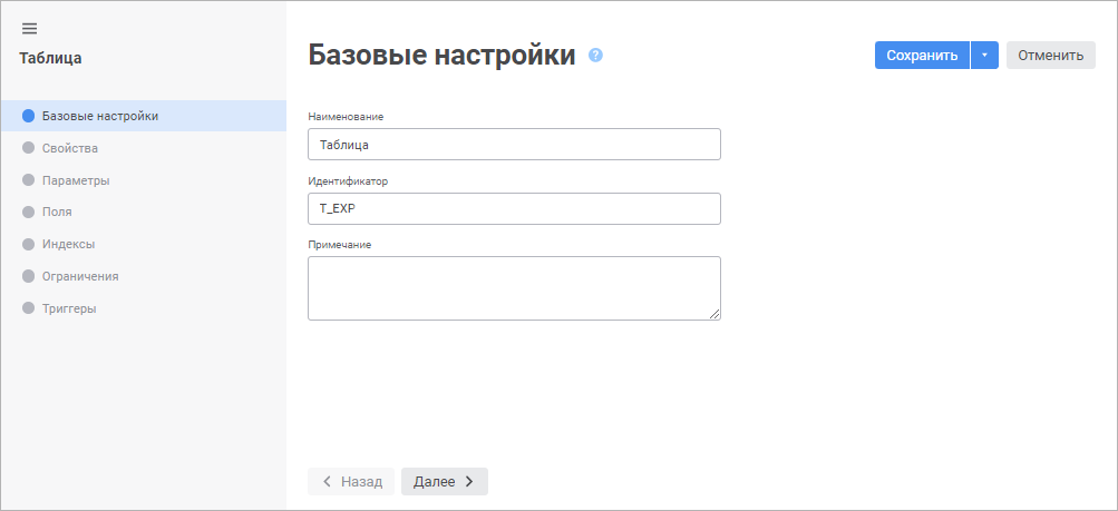 На странице «Базовые настройки» в веб-приложении и «Базовые свойства» в настольном приложении задаются наименование объекта, идентификатор и примечание.