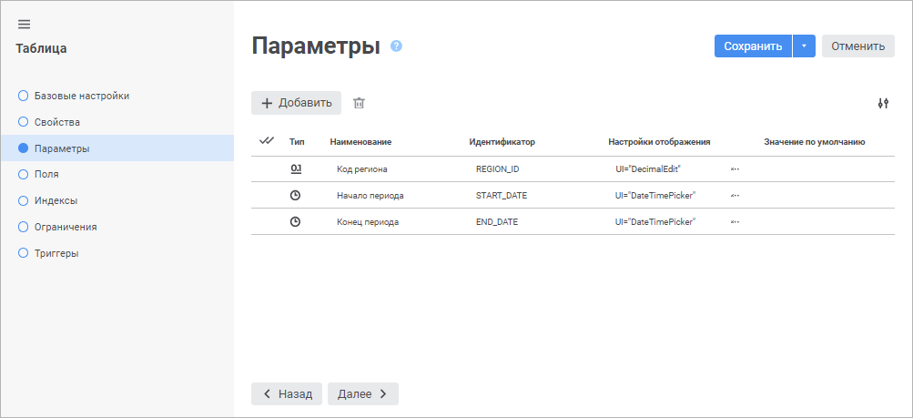 На странице «Параметры» задаётся список параметров объекта. Параметры позволяют формировать содержимое объекта динамически.