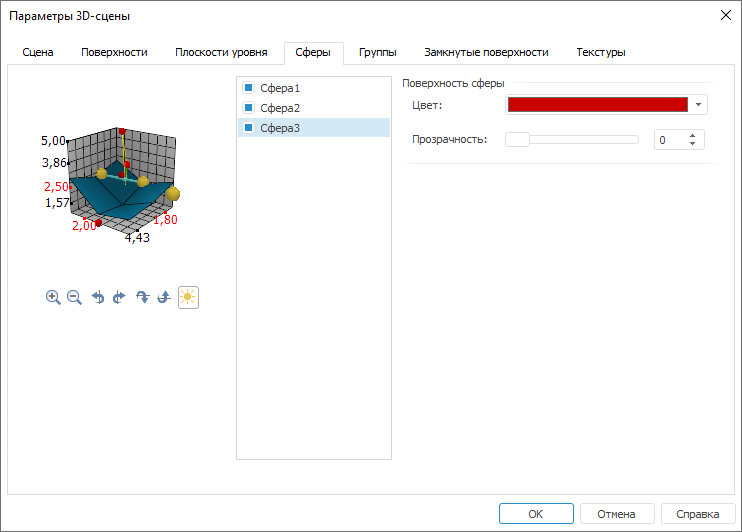 Для настройки параметров сферы перейдите на вкладку «Сферы» окна «Параметры 3D-сцены»: