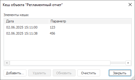 Для кеширования отчётов выполните команду контекстного меню «Кеш объекта» регламентного отчёта в навигаторе объектов. Откроется окно «Кеш объекта».