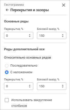 Доступно для всех типов гистограмм, всех типов смешанных диаграмм, если есть ряды типа «Столбик», каскадной, коробчатой, коробчатой с линейными рядами диаграмм.